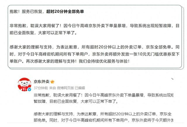 4月22日,就在京东发布四大举措的第二天,在中午高峰期,京东外卖下单量暴增,导致系统出现短暂故障。结果京东官方又道歉了,“非常抱歉,耽误大家用餐了!----目前已全面恢复,大家可以正常下单了”。而且再次履行承诺,“凡是没有取消订单且超时20分钟的一律免单,额外再赠送3张25-20的金券;凡是取消订单的一律赠送2张25-20的金券以供未来三天消费”。