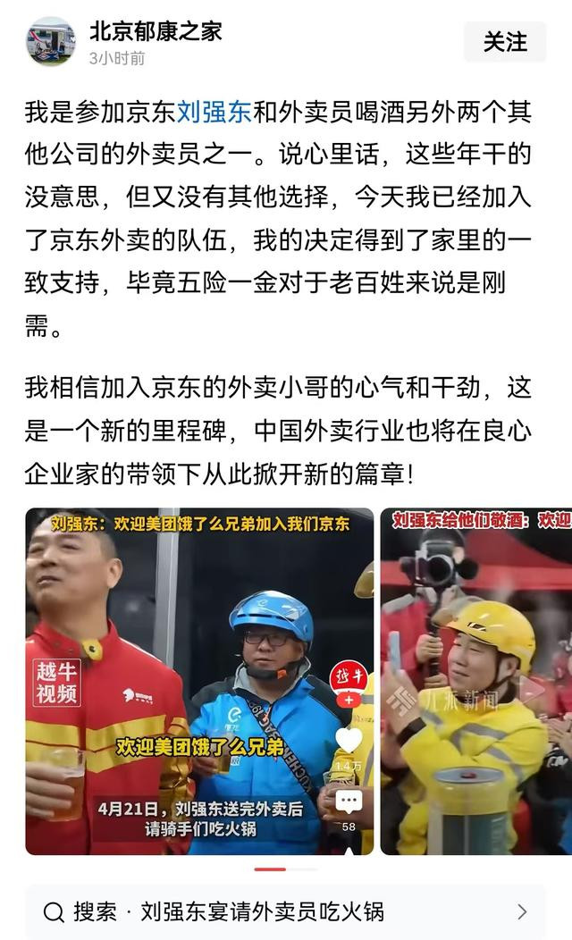 不仅仅如此,在4月21日,京东掌门人刘强东亲自体验送外卖,而且切切实实送了好几单,之后返回与外卖小哥共进火锅,不仅仅是与京东外卖小哥一起吃火锅,其他平台的小哥来了,也是一样的招待。有其他平台小哥在与东哥喝酒之后,也是激动的很,表示“社保还是需要的,这是长期保障自己利益的事情,决定转公司了”。